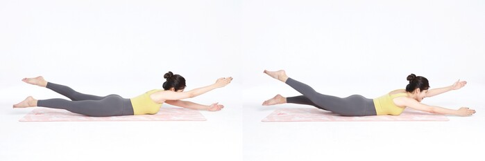 평소 스트레칭으로 척추 주변 근육을 키워주는 것도 좋은 방법 중 하나다. 누워서 쉽게 따라 할 수 있는 동작으로는 ‘척추기립근 강화 스트레칭’이 있다. 먼저 바닥에 엎드려 누워 양팔을 머리 위로 뻗는다. 이어 숨을 천천히 내쉬며 양팔과 다리, 머리, 가슴을 모두 위로 들어 올린다. 균형을 잃지 않도록 주의하며 수영하듯이 왼팔과 오른다리를 동시에 들어 올렸다가 반대로 오른팔 왼다리를 들어 올리는 동작을 빠르게 교차한다. 동작을 10회 반복하는 것을 한 세트로 총 3회 실시하면 척추기립근을 강화해 척추의 올바른 정렬과 골반 비대칭 개선에 도움이 된다.