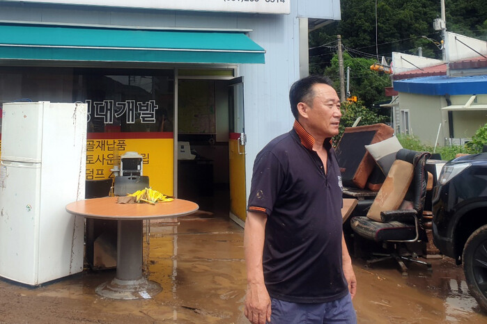 주민들에 따르면 8일 밤 11시 반쯤 동막천이 불어나자 차량을 옮기려고 운전대를 잡았던 나 씨가 경사로 위에서 쏟아지는 물 때문에 차량에 갇혔다.