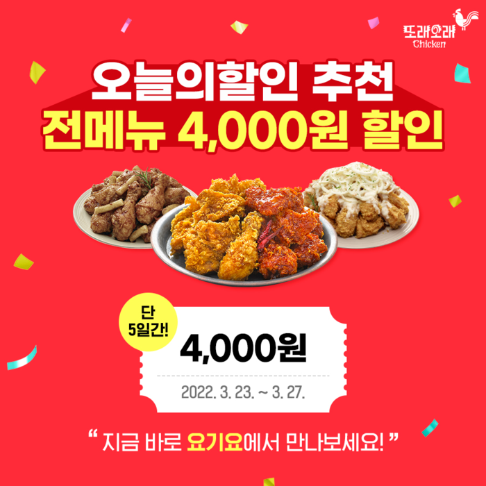 해당 프로모션은 배달어플 요기요의 오늘의 할인에서 진행하며, 또래오래의 인기메뉴 ‘갈릭반핫양념반’과 ‘단짠치킨’을 포함한 전 메뉴를 4000원 할인된 가격에 주문가능하다.