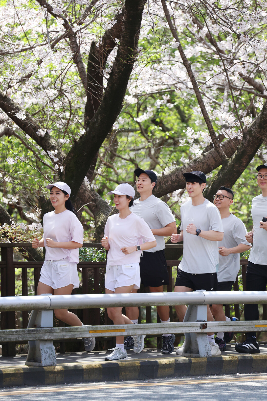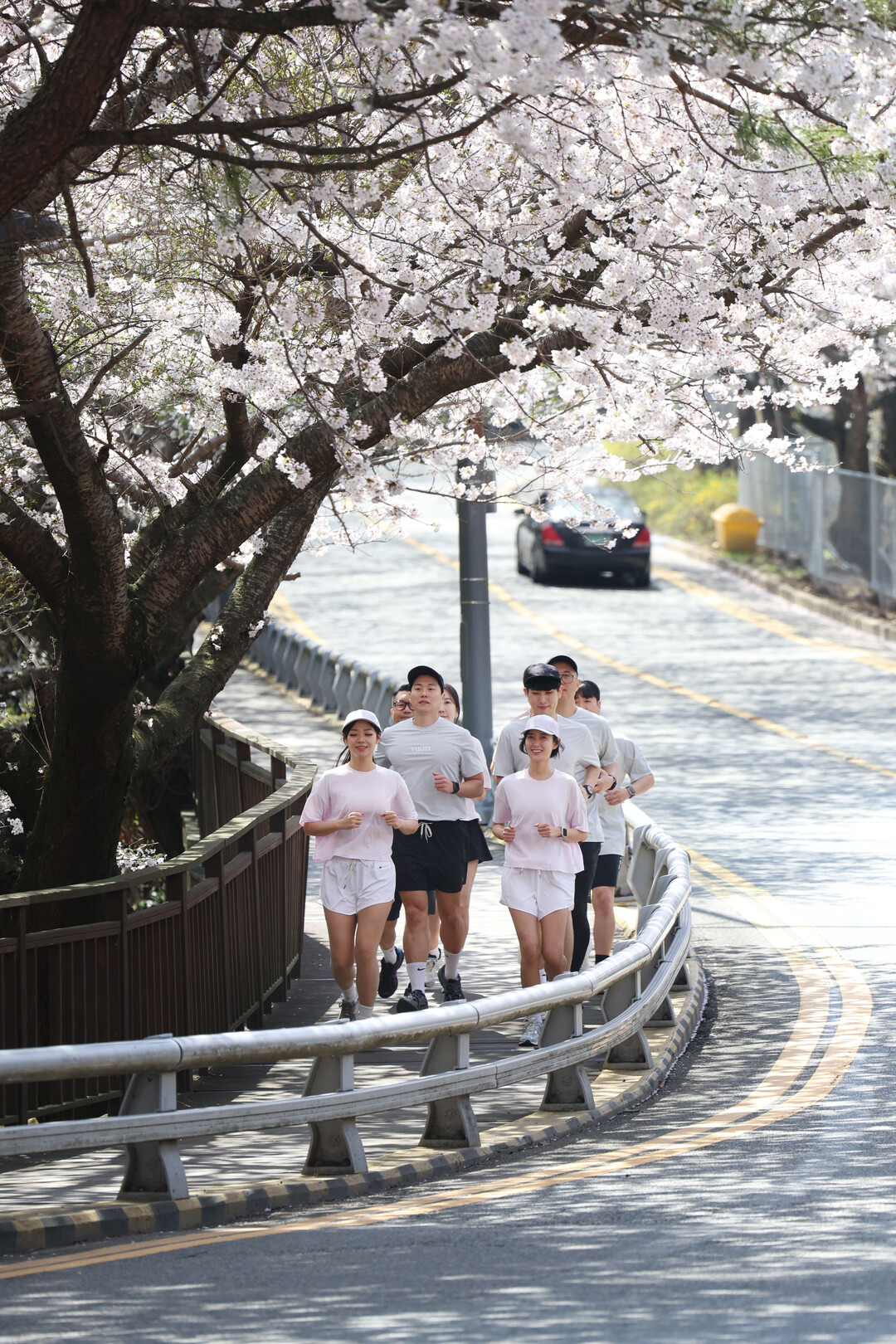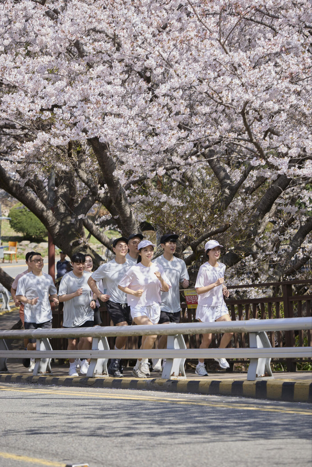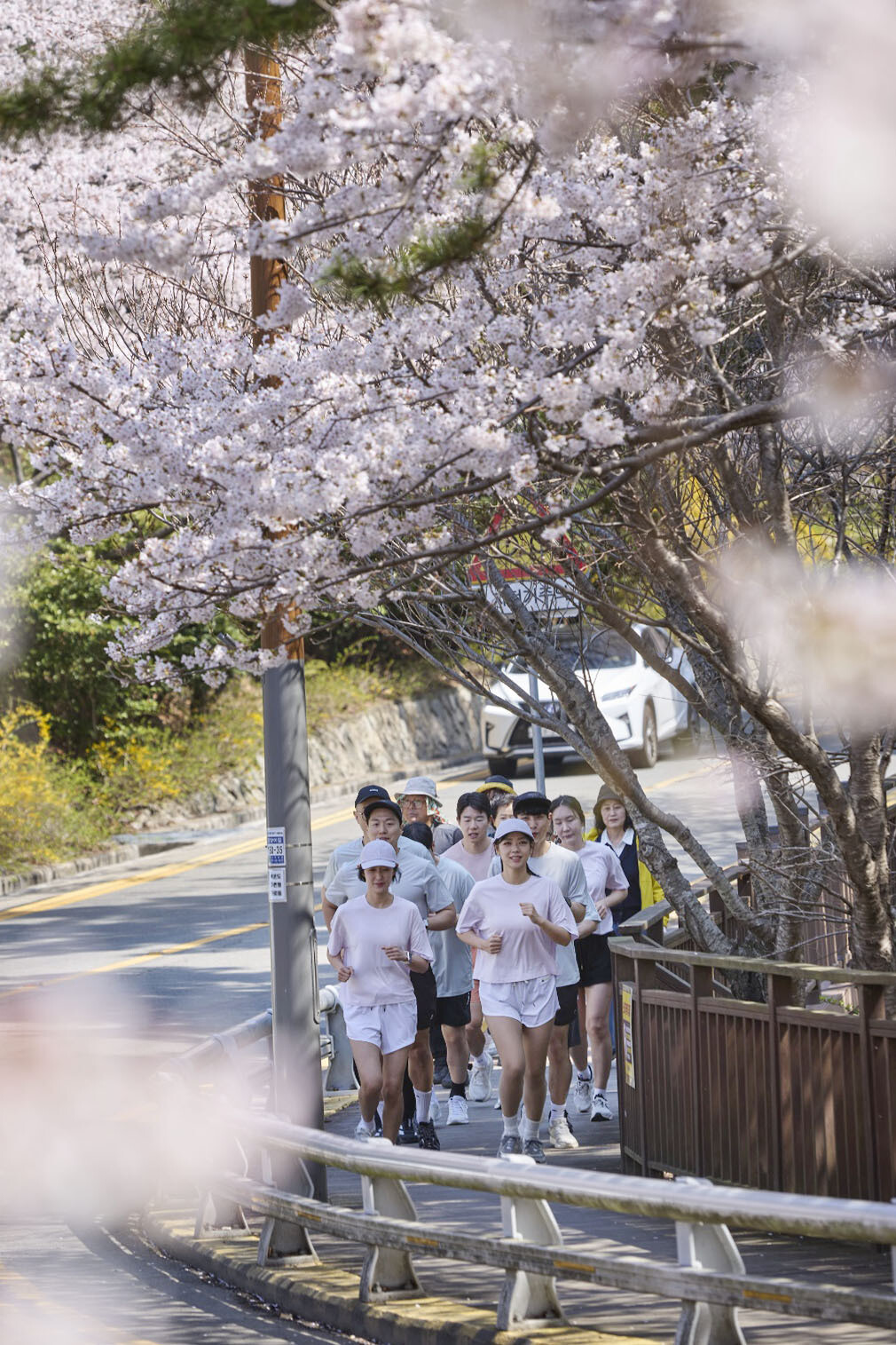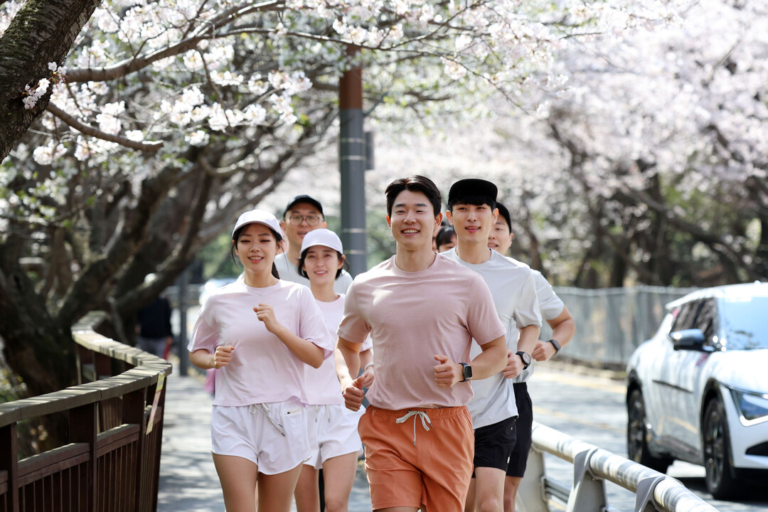 러닝 이벤트 참가자들이 파라다이스 호텔 부산 야외 가든에서 준비 운동을 마친 후 해운대 해변가와 벚꽃이 핀 달맞이길을 따라 뛰고 있다.