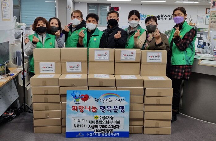 수성4가동 이성옥 부녀회 회장은 “새마을 회원들이 정성모아 준비한 꾸러미가 저소득주민들에게 작은 선물이 되었으며 좋겠다.”며, “주변 이웃들이 따뜻한 연말을 보내기를 바란다”고 말했다.