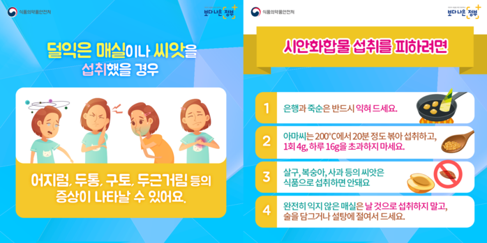 이에 따라 덜 익은 매실을 날 것으로 섭취하거나 복숭아, 살구, 사과 등의 씨앗을 섭취했을 경우 어지럼, 두통, 구토, 두근거림 등의 증상이 나타날 수 있어 올바른 섭취 방법을 익히는 것이 중요하다.