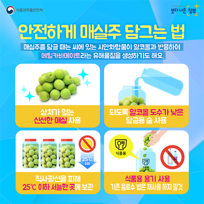 아울러 알코올 함량이 높을수록 에틸카바메이트의 생성량이 많아지므로 가급적 알코올 도수가 낮은 담금용 술을 사용하는 것이 좋다. 또 온도가 높아질수록 에틸카바메이트의 생성량이 증가하는 만큼 직사광선을 피해 25℃ 이하의 서늘한 곳에 보관해야 한다.