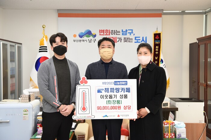 ▲하계순(오른쪽) 해파랑카페 대표가 지난 5일 부산 남구청장실에서 오은택(가운데) 구청장에게 지역 내 저소득 소외계층을 위한 9000만원 상당의 화장품을 기부한 뒤 기념촬영을 하고 있다. 남구 제공 |