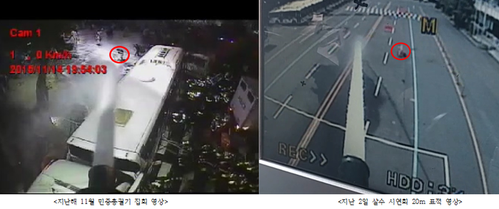 지난해 백남기 농민을 쐈던 기종과 동일한 살수차로 치러진 이날 시연회에서도 경찰은 표적에 살수를 하며 디지털 기기판에 의한 수작업이 아닌 발로 액셀을 밟아 살수했다.