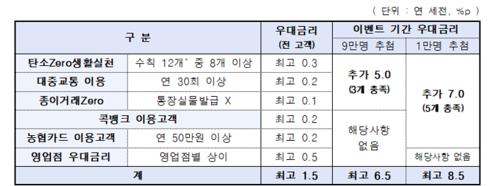 '탄소Zero챌린지적금'은 매월 10만원 한도의 1년 만기 상품이며 가입고객은 ▲탄소중립생활수칙 실천에 동참할 경우 최고 0.3%p ▲대중교통 이용 시 최고 0.2%p ▲적금통장 실물을 발급하지 않을 경우 최고 0.1%p의 우대금리를 적용받을 수 있다. 특히 3개 우대조건을 모두 만족하는 고객이라면 이벤트 추가 금리를 받을 수 있는데 농협은 10월 31일까지 추첨을 통해 9만명에게 5.0%p, 3개 조건과 콕뱅크·농협카드 이용실적까지 충족하는 1만명에게 7.0%p의 금리를 추가로 제공한다.