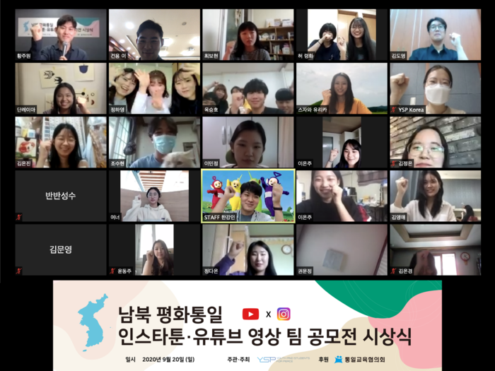 ▲20일 온라인으로 진행 된 YSP 통일 공모전 시상식에서 참가자들이 기념촬영을 하고 있다.(YSP 제공) |