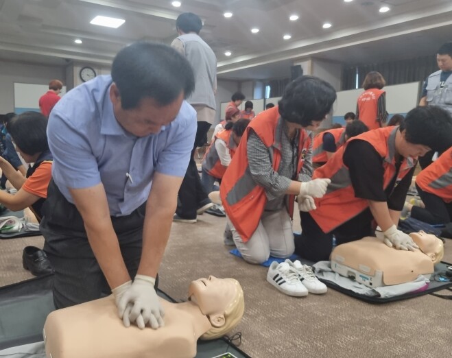 이번 교육은 응급환자 발생 시 119 신고, 심폐소생술 실시, 자동심장충격기 사용 등 심정지 환자 발생 시부터 119 구급대 도착 전까지 행동요령에 대해 심폐소생술 마네킹과 자동심장충격기를 가지고 직접 실습해 보는 등 실제 상황 시 당황하지 않고 대처할 수 있도록 현장감 있는 실습 위주의 교육이 이뤄졌다.