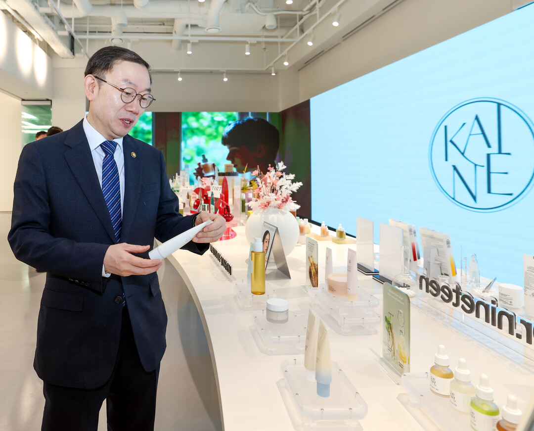 이명구 관세청장이 11일 서울시 강남구에 소재한 (주)구다이글로벌을 방문하여 K-뷰티 제품을 살펴보고 있다. 관세청 제공