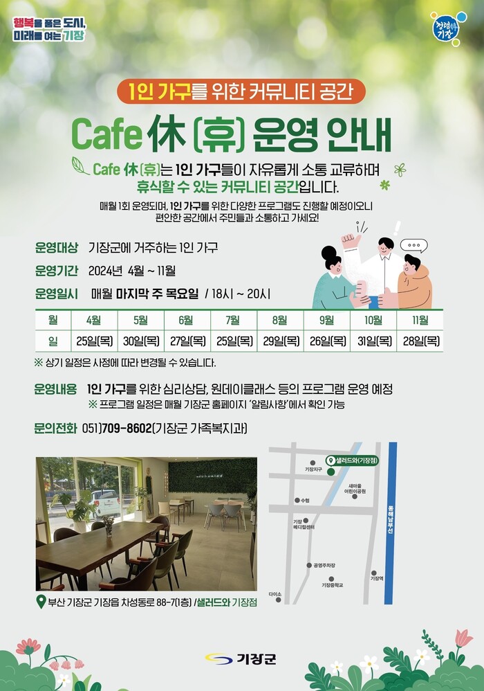 [로컬세계 부산=맹화찬 기자]부산 기장군(군수 정종복)은 증가하는 1인 가구 주민들의 사회관계망 활성화를 위해 커뮤니티 공간인 ‘Cafe 休(휴)’를 매월 1회 운영한다고 25일 밝혔다.