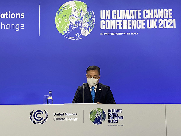 ▲최병암 산림청장이 2일(현지시간) 유엔기후변화협약 제26차 당사국총회 ‘글로벌 산림재원 서약’ 기자회견에서 연설하고 있다.(사진=산림청) |