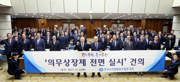 ▲23일(목) 수협중앙회(서울특별시 송파구 소재) 2층 독도홀에서 열린 제1차 임시총회에서 김임권 수협중앙회장을 비롯한 조합장들이 '의무상장제 전면 실시'건의문을 채택하고 기념촬영을 하고 있다.(수협중앙회 제공) |