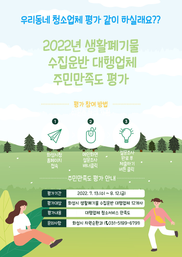 8월 12일까지 실시되는 이번 조사는 생활폐기물 수집·운반 대행업체의 청소서비스에 대한 만족도를 평가해 시민들에게 보다 나은 청소서비스를 제공하기 위해 실시된다.