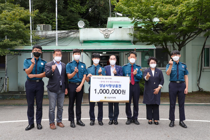 [로컬세계 김병민 기자]경기 성남시의회(의장 윤창근)는 17일 다가오는 추석을 맞아 관내 야탑동에 소재한 807의경대를 방문하여 의경들을 격려하고 위문금을 전달했다.