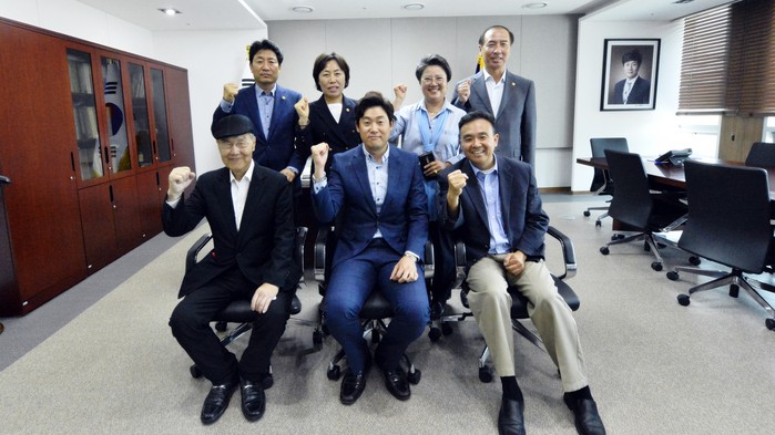 ▲마크 장 메릴랜드 주 하원의원(앞줄 오른쪽)이 29일 세종시의회를 방문해 고준일 의장(앞줄 가운데) 및 의원들과 기념촬영하고 있다. |