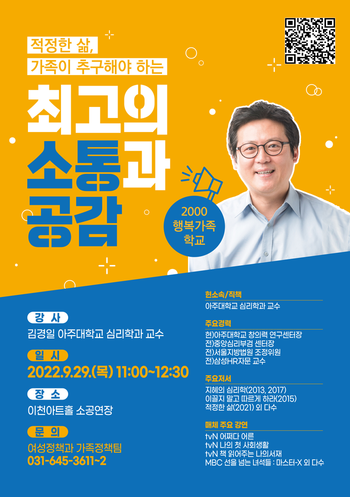 이날 강연은 1부 강연과 2부 Q&A 시간으로 진행되며, 2부 시간에 강연자에게 물어보고 싶은 가족 간 소통, 갈등, 역할 등의 질문을 이천시청 홈페이지 배너 또는 QR링크를 통해 사전에 받고 있다.