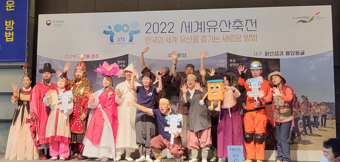 ▲‘2022 세계유산축전 통합 기자간담회’에서 세계유산축전 대표 프로그램을 퍼포먼스로 선보인 수원시, 경북, 제주도 관계자들이 기념촬영을 하고 있다. |