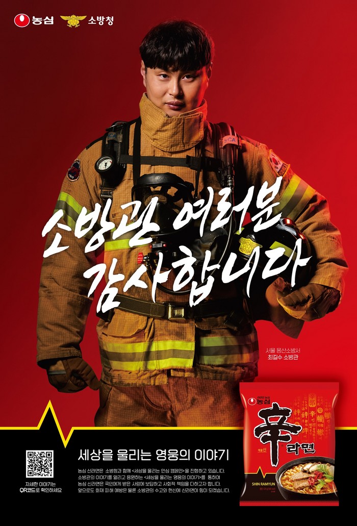 주인공은 지난 2017년 용산 다가구 주택 화재현장에서 온몸으로 불길을 막으며 주민 5명을 구조한 용산소방서 최길수 대원이다. 앞서 농심은 지난 1~2월간 라디오 방송을 통해 소방관에 얽힌 사연을 공모하고, 소개하는 활동을 펼쳤다. 이를 통해 접수된 219개의 사연 가운데 최길수 대원의 사연을 채택하고 한정판 제품과 광고를 통해 적극적인 알리기에 나선 것이다.
