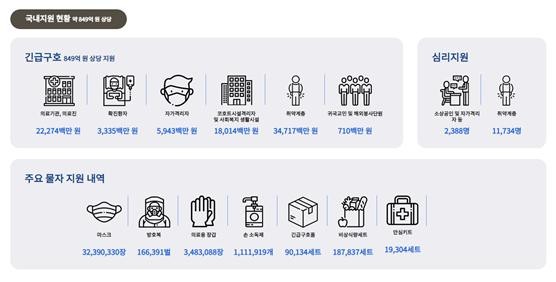 지금까지 적십자를 통해 지원된 의료 및 구호물품은 마스크 3239만장, 방호복 16만벌, 의료용 장갑 348만개, 손소독제 111만개, 긴급구호세트 9만개, 비상식량세트 18만개, 안심키트 1만9000세트에 달한다. 이외에도 적십자병원 4곳(서울, 인천, 상주, 영주)이 감염병 전담병원으로 지정되어 확진환자들을 치료하고 있다. 또한, 적십자는 거리두기 및 외부활동 축소로 헌혈이 줄어 위급한 환자들이 생명을 잃는 것을 예방하기 위해 혈액수급 안정화에도 만전을 기하고 있다. 그리고 전국 17개 재난심리회복지원센터에서 ‘코로나 블루(우울)’로 고통 받는 국민들을 대상으로 온·오프라인 심리상담도 전개 중이다.
