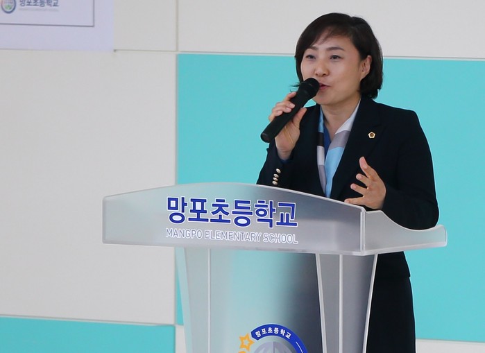 ▲1일 ‘수원 망포초등학교 개교 기념식’에 참석한 경기도의회 안혜영 부의장이 개교 축하 메세지를 전하고 있다.(경기도의회 제공) |