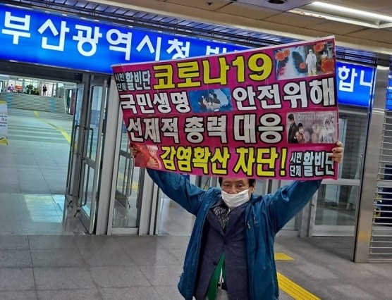 ▲시민단체 활빈단 홍정식 대표가 최근 부산시청사 출입구 앞에서 ‘코로나19 국민생명 안전 위해 선제적 총력대응 감염확산 차단’이라고 적힌 미니 현수막을 펼친 채 1인 코로나 확산차단 캠페인을 벌이고 있다.(활빈단 제공) |