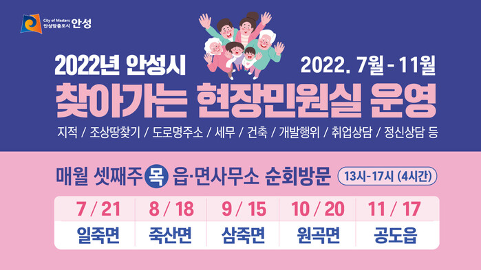 [로컬세계=김병민 기자]경기 안성시(시장 김보라)는 읍‧면 지역 등 원거리 주민들의 각종 생활불편 및 애로‧건의 사항을 현장에서 직접 듣고 양질의 행정서비스를 제공하기 위해 오는 21일 오후 1시부터 4시간 동안 일죽면사무소 2층 회의실에서 ‘찾아가는 현장민원실’을 운영한다고 밝혔다.