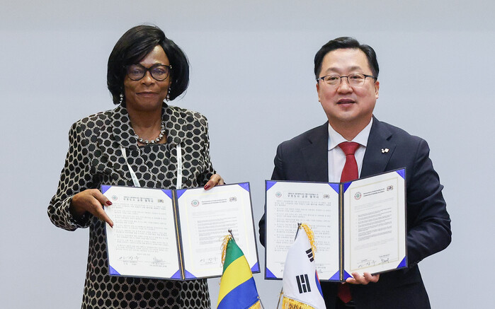 | ▲ 이장우 대전시장(오른쪽)이 10일 크리스틴 엠비에이 듀튬 가봉 리브르빌 시장과 우호도시 협약을 체결하고 기념촬영을 하고 있다. |