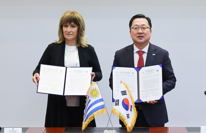 | ▲ 이장우 대전시장(오른쪽)이 10일 올가 오테귀 우루과이 몬테네그로 행정실장과 우호도시 협약을 체결하고 기념촬영을 하고 있다. |