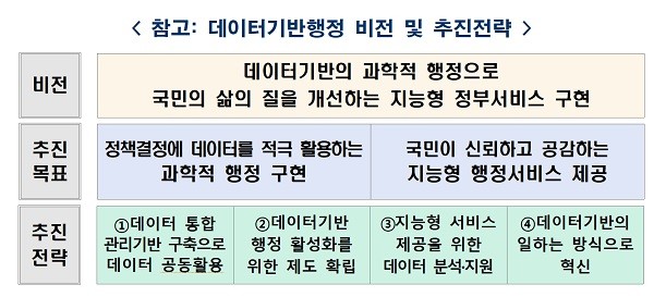 데이터 공동활용을 제한하는 법적 제약사항을 발굴 및 개선하고 데이터기반행정 활성화 위원회, 기관별 책임관 협의회, 민·관 혁신포럼 등 데이터기반행정 거버넌스도 운영할 계획이다.
