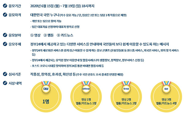 한편 행안부는 ‘정부24’에서 새롭게 제공하는 주요 서비스를 국민이 만드는 콘텐츠로 홍보하기 위해 ‘정부24 홍보콘텐츠 공모전’을 실시한다고 밝혔다.