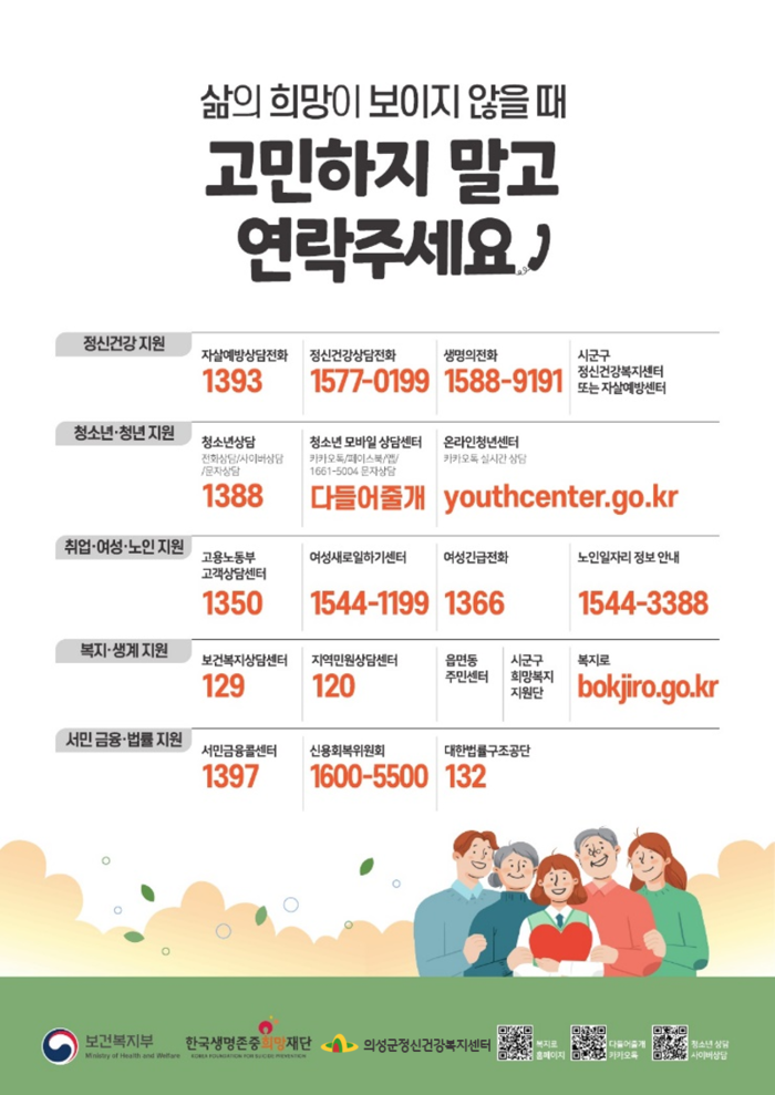 우울감 등 말하기 어려운 고민으로 전문가의 도움이 필요한 경우는 자살예방 상담전화, 정신건강 상담전화, 의성군정신건강복지센터를 통해 항상 상담을 받을 수 있다.