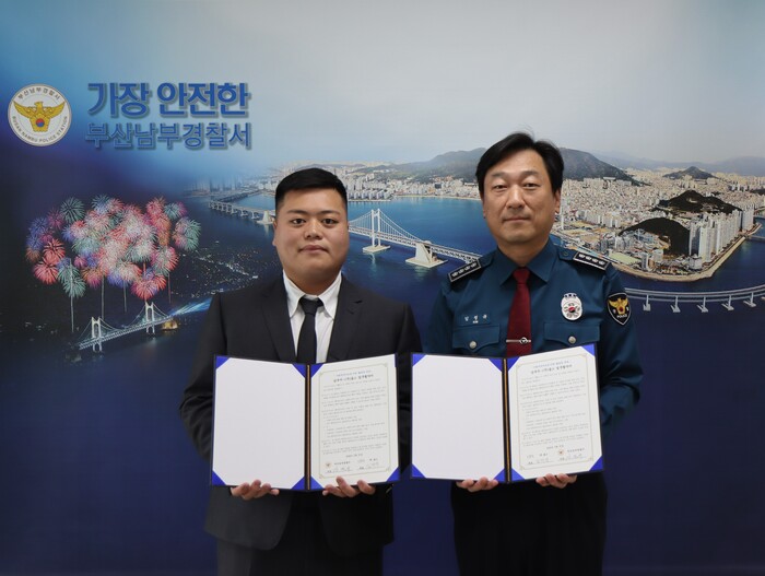 [로컬세계 부산=맹화찬 기자]부산남부경찰서는 27일 경찰서에서 ㈜옵스와 사회적 약자 보호ㆍ지원을 위한 업무협약을 체결했다.