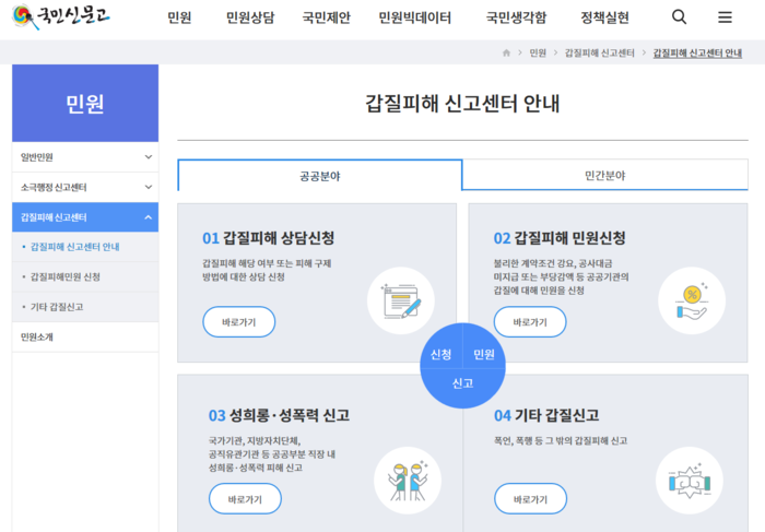 또한 국가기관에의 신고체계 일원화 및 조치를 위해 7월부터 공동주택 경비원 등에 대한 갑질신고를 범정부 ‘갑질피해 신고센터’(국민신문고)로 일원화한다.