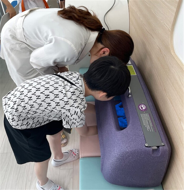 ‘손씻기 교육용 뷰박스’는 세균 역할을 하는 형광로션을 바르고 평소 습관대로 손을 씻은 후 남아 있는 형광물질을 눈으로 확인할 수 있는 기구이다.