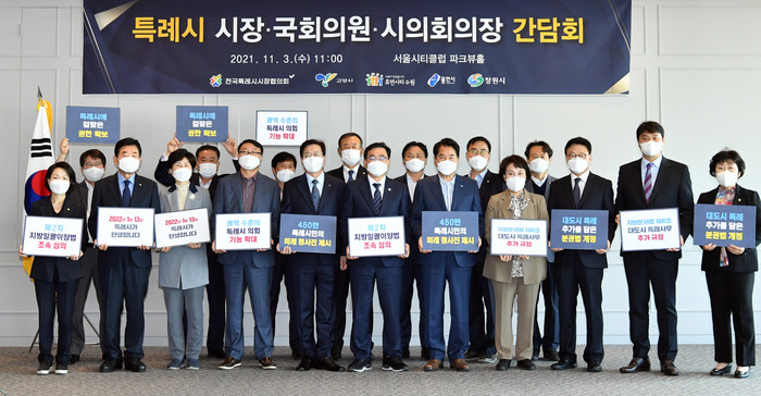 이날 간담회에는 조석환 수원시의회 의장 등 특례시의회 의장과 김승원(수원갑)·백혜련(수원을)·김영진(수원병)·박광온(수원정)·김진표(수원무) 의원 등 지역 국회의원, 염태영 수원시장을 비롯한 특례시 시장이 참석해 성공적인 특례시 출범을 위한 촉구 성명서를 발표했다.