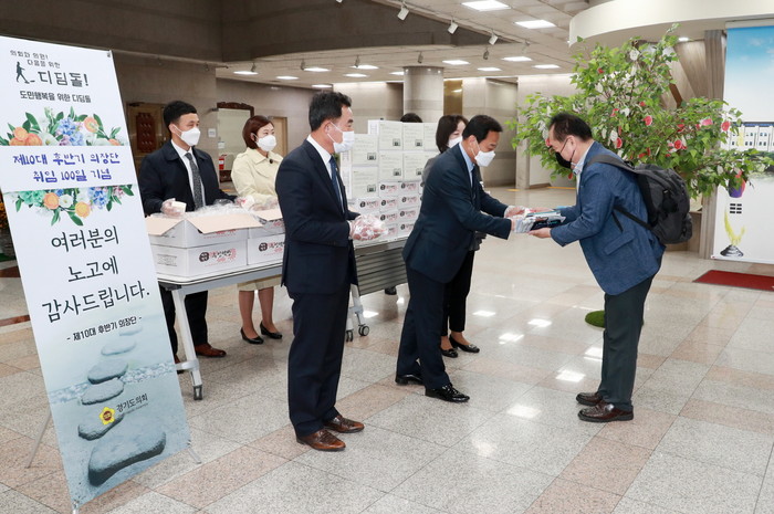 [로컬세계 고기훈 기자]장현국 경기도의회 의장(더민주, 수원7)이 제10대 의회 후반기 의장단 취임 100일을 기념해 의회사무처 직원들에게 ‘백일떡’을 손수 나눠주며 감사와 존중의 마음을 전했다.