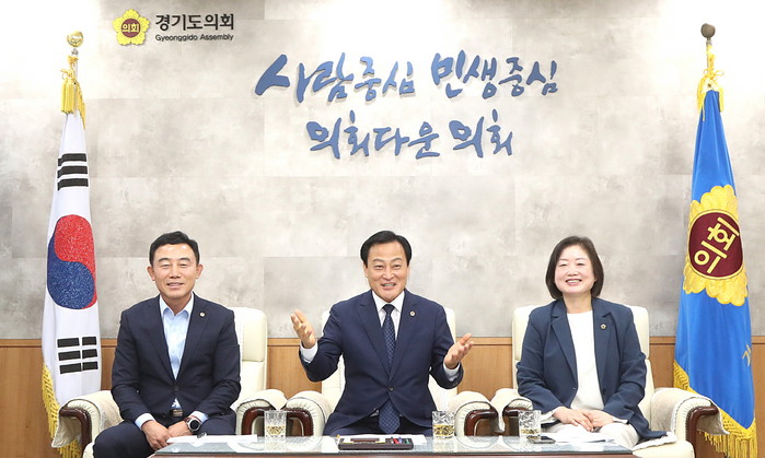 ▲경기도의회 후반기 의장단이 취임 100일을 맞았다. 왼쪽부터 경기도의회 진용복 부의장, 장현국 의장, 문경희 부의장.(경기도의회 제공) |