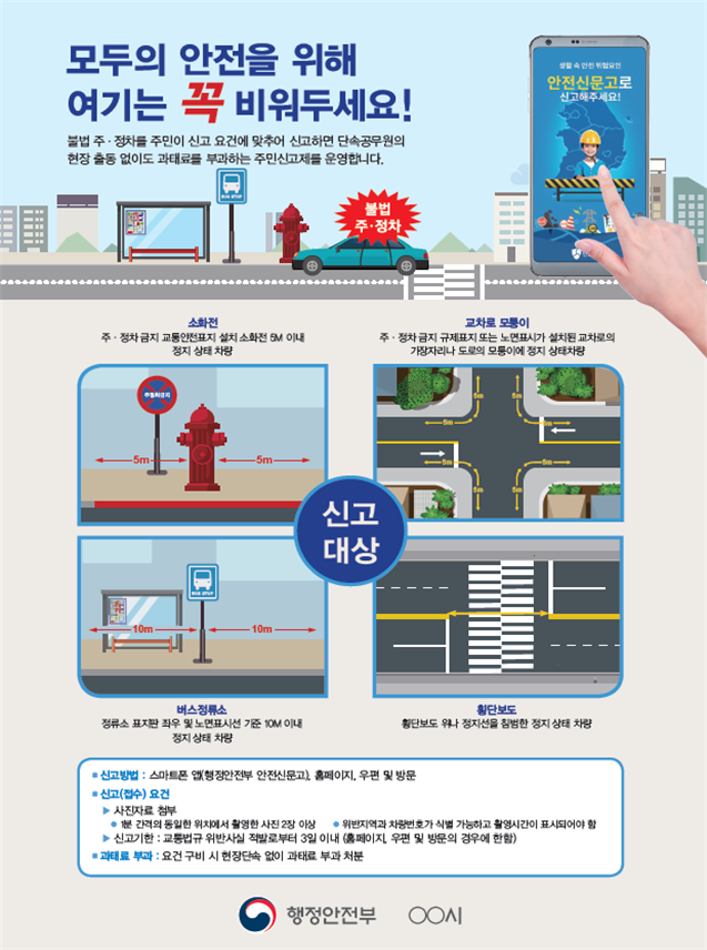 행정안전부는 4대 절대 불법 주·정차 관행을 근절하기 위한 범국민운동을 추진하고 이러한 내용을 담은 ‘주민신고제’를 17일부터 본격 시행한다고 밝혔다.