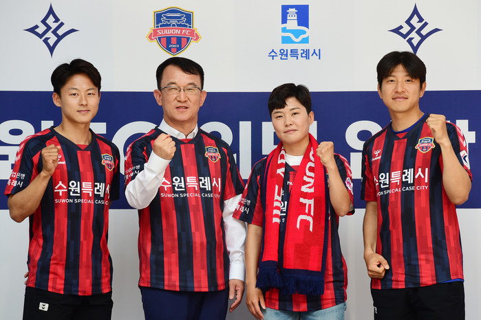▲지소연 선수의 입단을 축하하러 온 수원FC 이승우(왼쪽 첫 번째)·박주호(오른쪽 첫 번째) 선수와 조청식 시장 권한대행(왼쪽 두 번째)이 기념촬영을 하고 있다. |