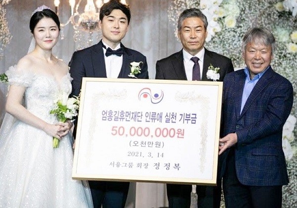 기부금을 전달한 정 회장은 “오늘 뜻깊은 결혼식장에서 기부금을 전달한 것은 사랑하는 아들과 며느리가 평생 인류애를 실천하고 봉사하는 마음으로 살기를 바라는 깊은 뜻이 담겨 있다”라고 말했다.