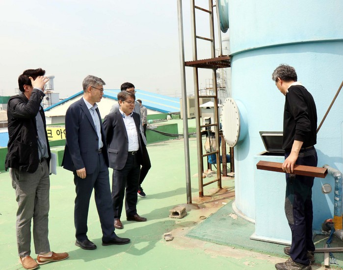 ▲박광석 환경부 기획조정실장과 김동구 수도권대기환경청장이 5월 15일 경기도 안산시 소재 한 소규모 영세 업체를 방문하여 대기오염방지시설을 확인하고 있다.(사진=수도권대기환경청 제공) |