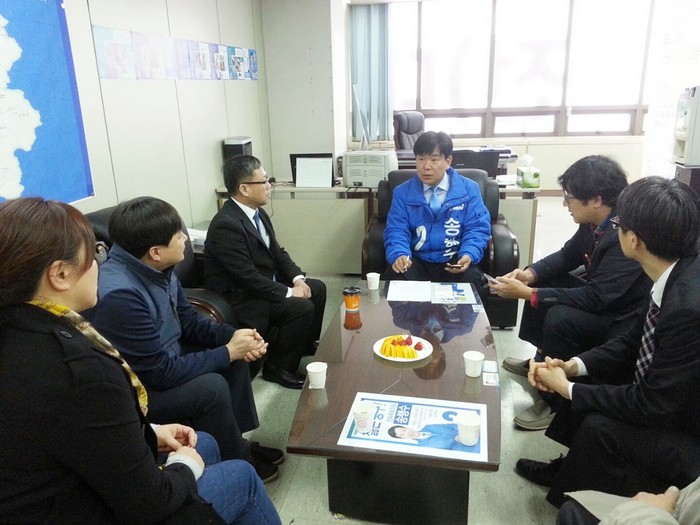 ▲ 24일 송행수 후보가 선거사무소에서 수의사협회 관계자들과 간담회를 갖고 있다. |
