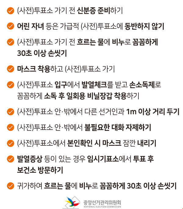 그러면서 투표 가기 전과 귀가 후 손씻기를 철저히 하고, 투표소에서는 마스크를 착용하며 다른 선거인과 1m 이상 거리를 두어야 한다고 밝혔다.