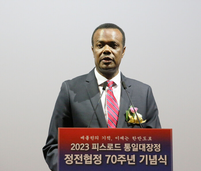 ▲ 2023 피스로드 통일대장정 및 정전협정 70주년 기념식에서 축사하는 데시 달케 두카모 주한에티오피아 대사 |