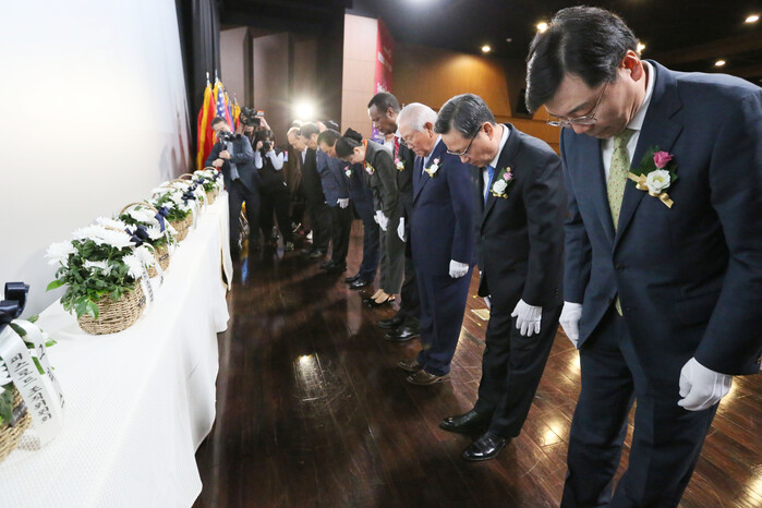 ▲ 2023 피스로드 통일대장정 및 정전협정 70주년 기념식에서 한국전쟁 UN참전국 참전용사 희생자 추모 헌화 |