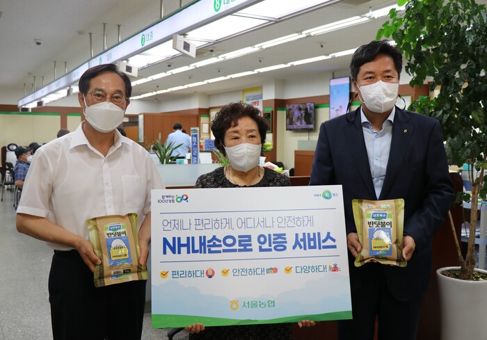▲농협 서울지역본부는 12일 서서울농협에서 'NH내손으로(바이오 인증 서비스)'등록행사를 가졌다. (왼쪽부터 서서울농협 조원민 조합장, 'NH내손으로'가입고객, 농협서울지역본부 황준구 본부장)/ 서울농협 제공 |