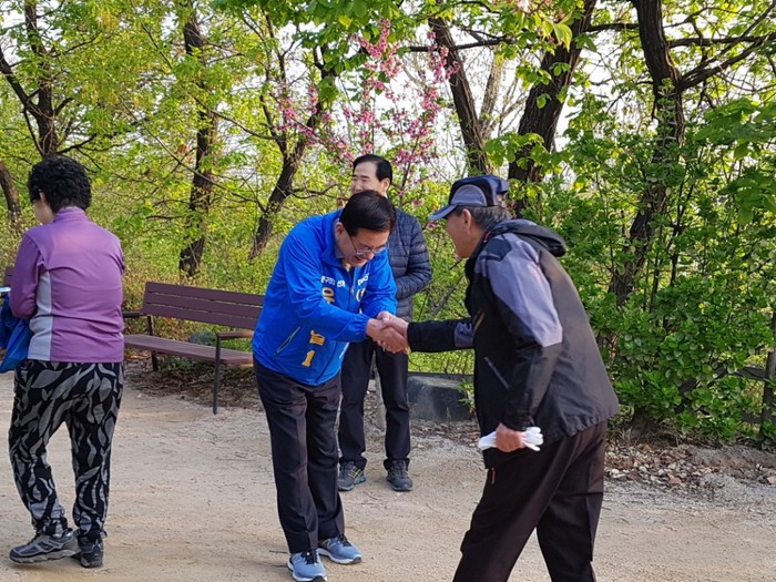 ▲유덕열 동대문구청장 후보가 배봉산에서 구민들과 반갑게 인사를 나누고 있다.(유덕열 동대문구청장 후보 캠프 제공) |