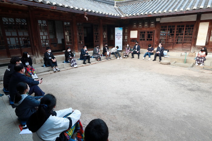 종택 앞뜰에 디귿자(ㄷ) 형태로 둘러앉은 장현국 의장 등 의원들과 청소년들은 ‘의장이 생각하는 청렴의 의미’, ‘청소년이 가짜뉴스를 걸러내고 좋은뉴스를 찾는 방법’ 등에 대해 이야기를 나눴다.