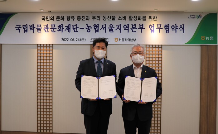 농협서울지역본부(본부장 황준구)와 국립박물관문화재단(사장 김용삼)은 24일 농협서울지역본부에서 ‘우리 농산물 소비 확대와 국민의 문화향유 증진’을 위한 업무협약(MOU)을 체결했다.