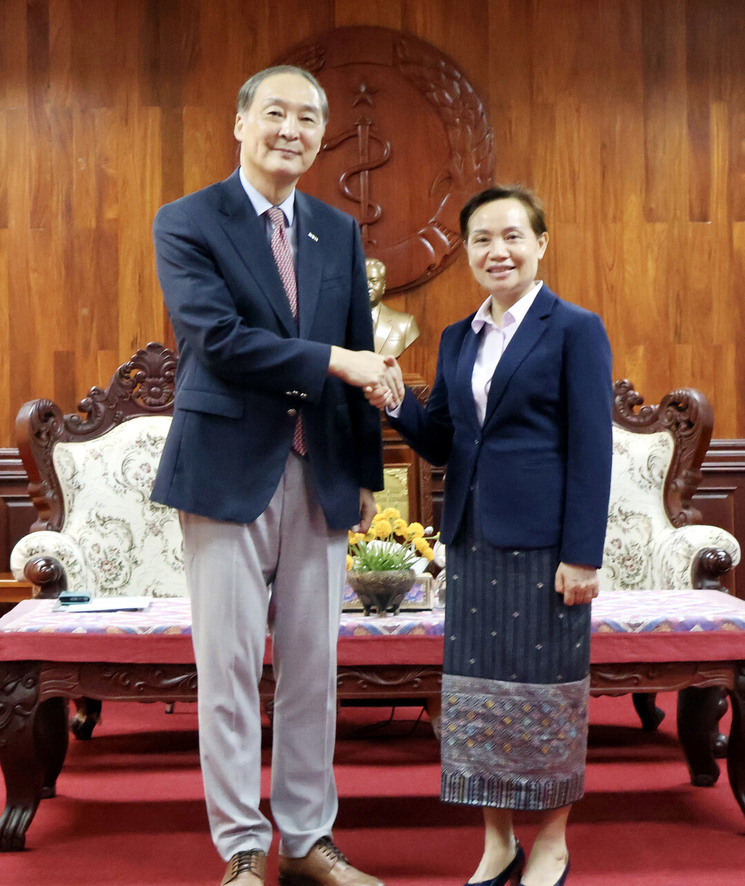 장원삼 코이카(KOICA, 한국국제협력단) 이사장이 6일 라오스 수도 비엔티안에서 바이캄 카띠야 라오스 보건부 장관을 면담한 후 기념사진을 촬영하고 있다.